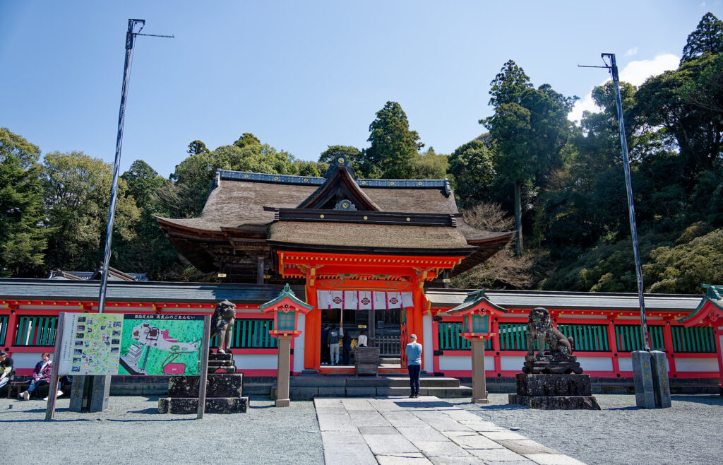 Erster Halt war der Usa Hachimangū, einer der bedeutendsten Hachiman-Schreine Japans. Die weitläufige Anlage, die roten Gebäude und die ruhige Atmosphäre machen diesen Ort besonders eindrucksvoll.